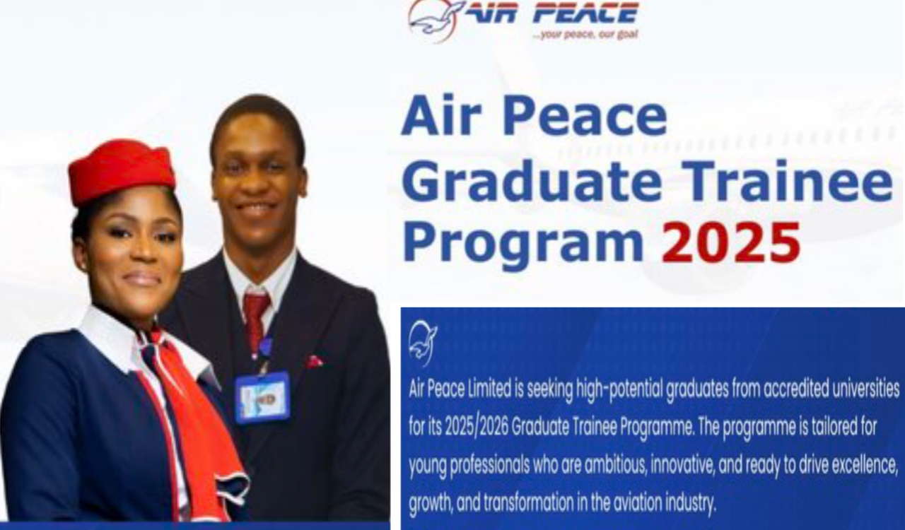 Air Peace 2025/2026 Graduate Trainee Program for Nigerians The Air Peace Limited call applications for their 2025 Air Peace Graduate Programme. The Air Peace Limited is seeking an applications...